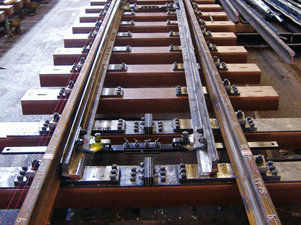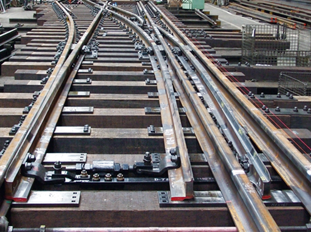 This turnout integrates two tracks of different gauges into a single turnout structure. While standard turnouts use two rails, three rails are required to accommodate two different track gauges.